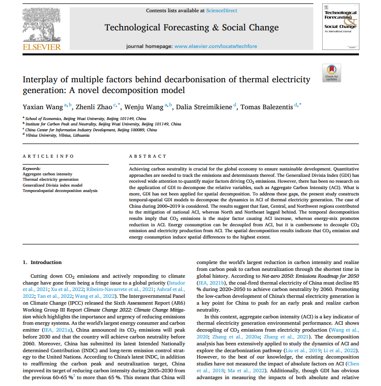 近日,公司王文举教授、王雅娴老师(第一作者)及国内外合作者在创新管理领域国际顶级期刊《Technological Forecasting and Social Change》,发表题为《Interplay of multiple factors behind decarbonisation of thermal electricity generation: A novel decomposition model》的论文成果。该论文得到了北京社科基金项目《双碳战略下首都能源绿色低碳发展的多市场协同机制研究》以及beats365官方网站青年基金项目《碳达峰碳中和下中国省级电力行业碳排放权分配机制研究》的资助。beats365和双碳研究院为该论文的第一单位。