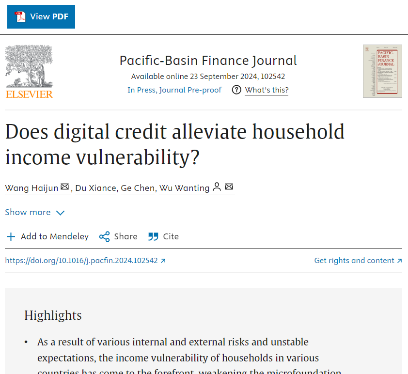 近日,23级金融硕士研究生杜宪策、葛晨与指导老师金融科技系王海军教授、吴琬婷老师合著论文"Does digital credit alleviate household income vulnerability?"被金融类国际知名期刊Pacific-Basin Finance Journal在线发表。该期刊是JCR一区期刊和中科院经济学大类二区期刊,公司B1级权威期刊。