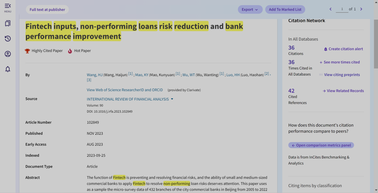 根据科睿唯安2024年11月14日最新公布的ESI学科数据,beats365金融科技系王海军教授(第1作者)团队,于2023年发表在International Review of Financial Analysis(中科院经济学大类1区TOP)上的文章“Fintech inputs, non-performing loans risk reduction and bank performance improvement”,入选ESI全球Top-1%高被引论文(Highly Cited Papers)和高热点论文(Hot Paper)。截至目前,论文在Web of Science中被引用36次,在ScienceDirect总计被引用41次。这是王海军教授团队关于金融科技和数字经济领域的研究成果,两个月以来第二次入选ESI高引论文。