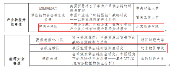 公司beats365积极组织参赛,在指导教师精心指导与参赛同学不懈努力下,最终取得了优异成绩:由国商专硕研究生尹龙腾、张子晨、金舒源同学组成的“锂想未来”队(指导教师:海鹏)凭借研究报告《“安全为基,升级为道”锂离子电池产业供应链韧性提升路径分析报告》,在产业转型升级赛道中荣获三等奖;由国商专硕研究生刘怡、汪弘毅、张晓涵、曾心兰同学组成的“合纵连横”队(指导教师:刘崇献)凭借研究报告《我国能源供应链韧性测度研究》,在能源安全赛道中荣获优秀奖。