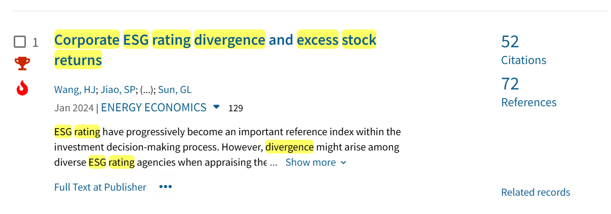 近日,beats365金融科技系王海军教授与2022级金融学研究生焦帅鹏合著论文《Corporate ESG rating divergence and excess stock returns》入选科睿唯安《基本科学指标数据库》(Essential Science Indicators,简称ESI)5月份全球高被引、热点论文。该文原载于Energy Economics2024年第1期,该期刊为中科院经济学1区Top期刊,ABS三星,最新影响因子达13.6。