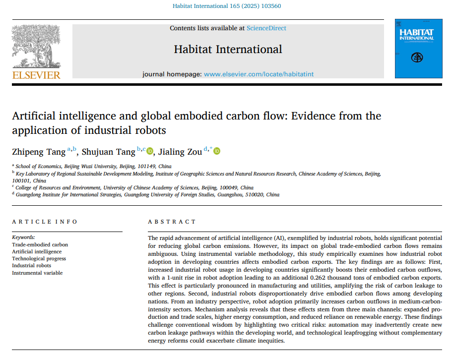 近日,公司经济学系唐志鹏教授(第一作者)与中科院地理科学与资源研究所研究生汤淑娟和广东外语外贸大学邹嘉龄副教授(通讯作者)合作学术论文“Artificial Intelligence and Global Embodied Carbon Flow: Evidence from the Application of Industrial Robots”在国际期刊《Habitat International》上录用发表,该项研究成果得到了国家自然科学基金项目的资助。《Habitat International》期刊由联合国人居委员会于1976年创办,主要关注发展中国家的城乡人居环境,聚焦发展研究、环境研究、区域与城市规划以及城市研究等多学科问题。该期刊系SSCI检索期刊,是中科院经济学大类1区TOP期刊,JCR一区,最新影响因子为7.0,CiteScore值为10.9,JCI指标学科分区排名为:Development Studies(6/65)、Environmental Studies(23/191)、Regional & Urban Planning(4/55)、Urban Studies(6/77),属于国际权威期刊。