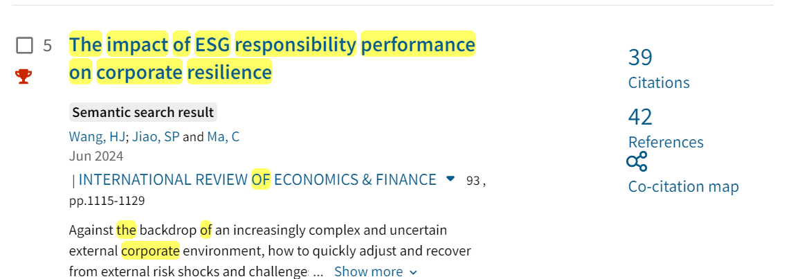 根据科睿唯安《基本科学指标数据库》(Essential Science Indicators,简称ESI)9月13日公布的最新数据,beats365金融科技系王海军教授与2022级金融学硕士研究生焦帅鹏合著论文《The impact of ESG responsibility performance on corporate resilience》入选科睿唯安9月份全球高被引论文,文章目前全球累计被引39次。文章原载于International Review of Economics and Finance2024年第6期,该期刊为中科院经济学大类2区期刊。根据公司最新期刊分级目录,ESI高被引论文为A1级论文。