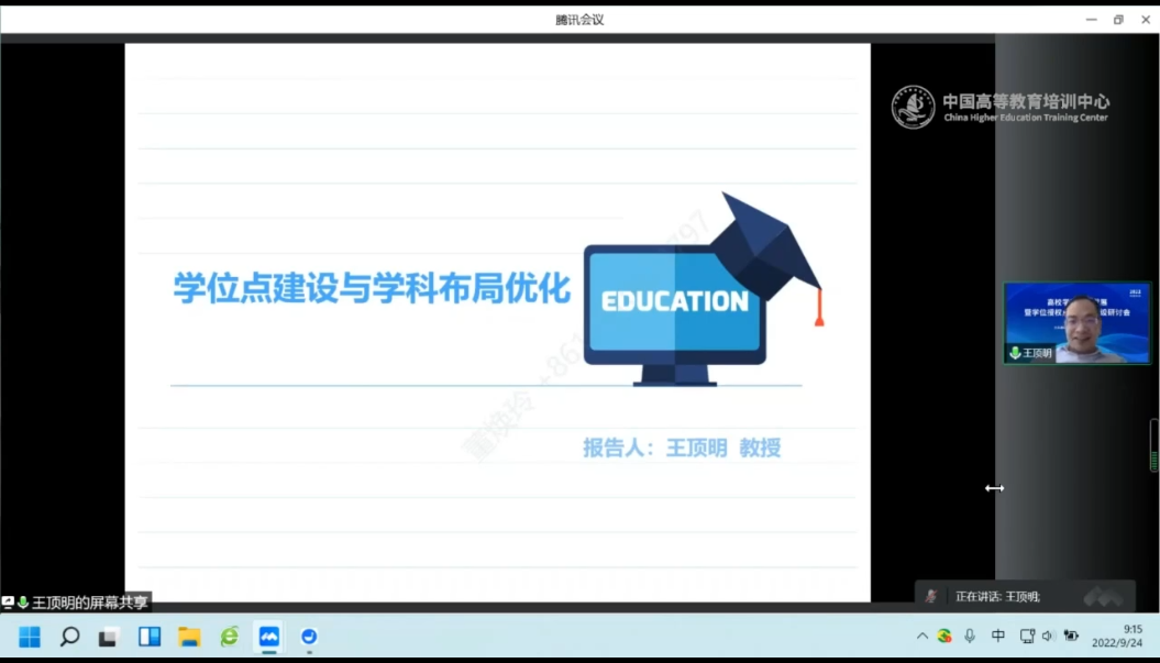 会议第一阶段,组织学科负责人集中观看高校团队建设发展暨学位授权点申报与建设研讨会线上培训视频,一起学习了由北京理工大学人文与社会科学公司教授,中国学位与研究生教育学会研究生教育学专业委员会委员兼副秘书长王顶明教授带来的《学位点建设与学科布局优化》主题培训,了解了我国学位点建设历程、学科布局如何优化以及实现高质量发展的路径。