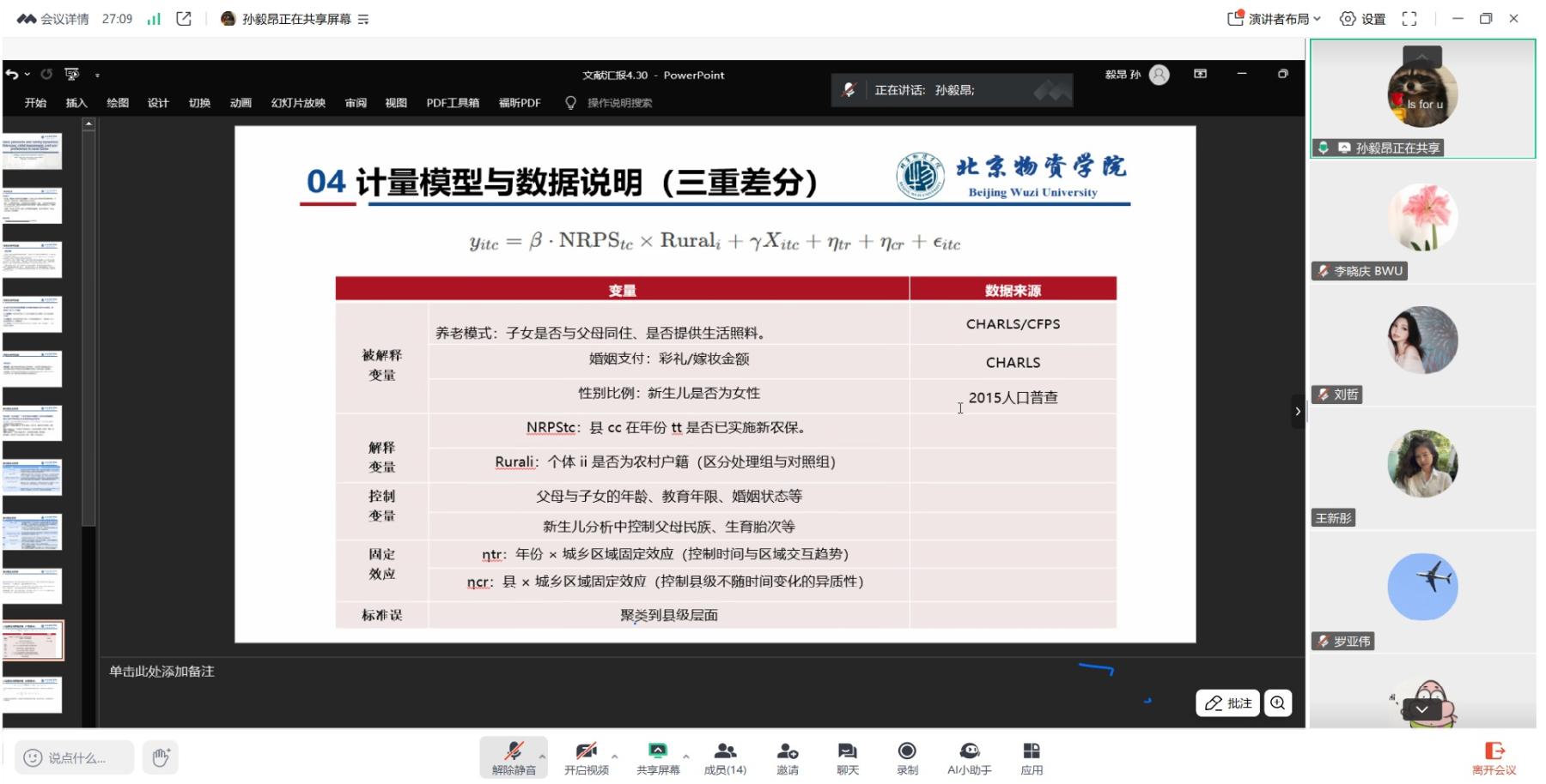 首先,孙毅昂同学分享的是一篇2025年发表在《Journal of Development Economics》的研究“Public pensions and family dynamics: Eldercare, child investment, and son preference in rural China”。这篇研究使用三重差分DDD方法探讨了中国新农保政策(NRPS)如何通过经济保障功能,重塑农村家庭的养老模式、婚姻支付和生育选择。这项研究不仅揭示了公共养老金的经济效应,更深入分析了它对传统文化的深远影响,比如高额彩礼和性别偏好,这些发现为发展中国家设计社会保障政策提供了重要启示。