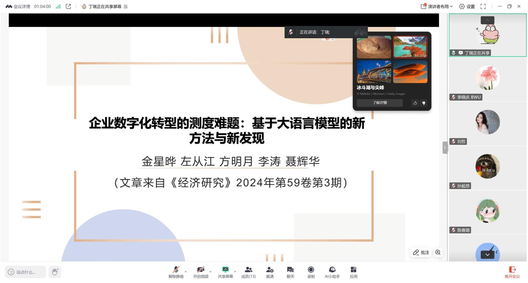 接着,丁瑞同学分享的是一篇2024年发表在《经济研究》的“企业数字化转型的测度难题:基于大语言模型的新方法与新发现”。该研究针对企业数字化转型测度难题,提出基于ERNIE大语言模型的新方法,突破传统词典法、客观数据法及事件冲击法的局限,该测度方法为经济学研究提供了新范式,证实数字化转型对高质量发展的实际价值,并在附录提供了300多个数字化转型的关键词词典,为后续研究提供了极大便利。