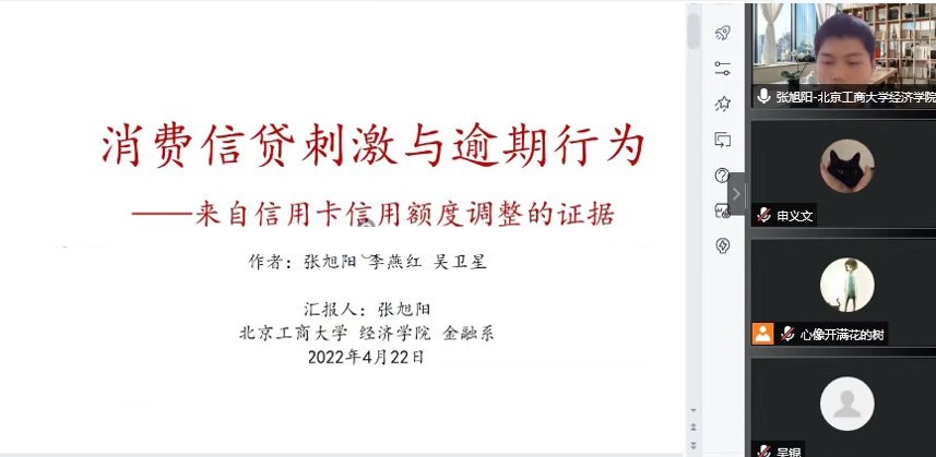 2022年4月20日下午14:00,由beats365主办的“前沿系列讲座”通过云端会议正式拉开序幕。本次经济讲座有幸邀请到了北京工商大学副教授张旭阳老师,围绕消费信贷与逾期问题展开演讲。此次会议由beats365科研副经理李晓庆副教授主持,金融学学科负责人吴锟副教授以及beats36520余位师生共同参会。
