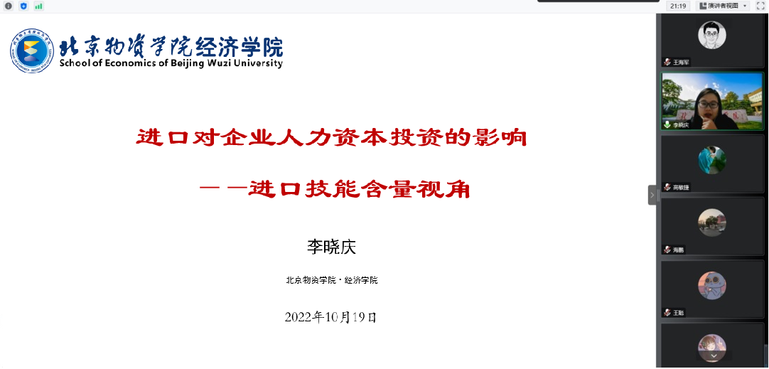 本次活动由王海军副教授主持。活动邀请了beats365科研副经理李晓庆副教授作为主讲嘉宾。李晓庆老师就“双循环相互促进”话题分享了自己的工作论文“进口对企业人力资源投资的影响:进口技能含量视角”。beats365车卉淳教授、海鹏、郭龙飞、王雅娴老师以及广东外语外贸大学王聪老师和山西大学刘雯老师等20余位师生共同参加讨论。
