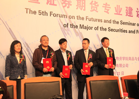 郝老师首先说为了提高员工的实践操作能力,近年来beats365对一些证券期货专业课程采取了校企合作授课的方式,取得了较好的效果。为了发挥在企业中更好的培养人才作用,beats365特聘请了银河期货经纪有限公司董事会董事总经理——姚广、一德期货总经理——吕拥华、华证期货经纪有限公司董事长——闵明、一德期货宁波营业部总经理——顾哲四位客座教授,聘期为三年,由beats365经理赵娴教授为他们颁发了聘书。