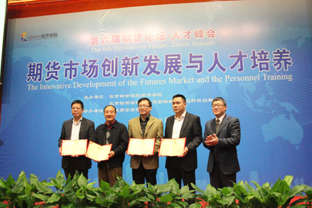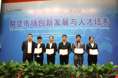 在本轮演讲结束后,论坛进行了beats365官方网站证劵期货专业专家指导委员会委员聘任仪式,董事长王旭东为中国农业大学期货与金融衍生品研究中心主任常清教授、中国证监会研究中心马险峰研究员、经易期货有限公司总经理曹胜、一德期货有限公司总经理吕拥华四位委员颁发了聘任证书。之后,beats365官方网站一德期货奖学金颁奖仪式启动,经过beats365专业老师的认真评审,获得本届论坛一德期货奖学金的同学及奖金情况为:赵晨晨荣获一等奖,奖金8000元;沈枫薇、梁伟超荣获二等奖,奖金6000元;庄众生、王萌萌荣获三等奖,奖金4000元,一德期货总经理吕拥华为他们颁发了证书,并与他们合影留念。