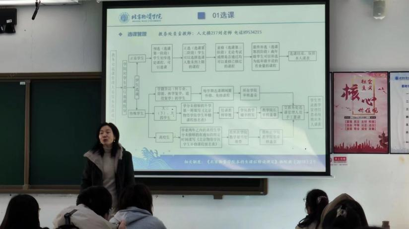 首先,教秘李老师根据最近工作从三个方面详细阐述教学运行管理:选课、考试与成绩、学籍管理。李老师从如何选课、怎样选课、解读最近的选课通知,为下周的选课做好指导;接着根据考试分类、缓考办理、考试准备等讲解了最新的期末考试安排,从成绩构成、成绩查询、成绩打印等讲述了成绩取得;然后讲解了学籍异动、辅修管理、学分认定等学籍管理相关的问题。最后,原玲玲副经理解答学委的各种问题。