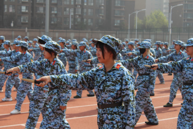突破常规,匕首操作为军训的特色科目,可以培养同学们坚忍不拔、顽强勇敢的战斗作风与尚武精神,有部分女生在学习。