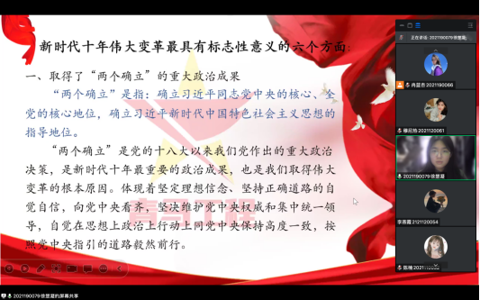 通过本次宣讲会,唤起了同学们爱国,爱党的初心,更深入理解了二十大召开的意义,不论是大会的相关信息与主题,党的中心任务和战略安排等理论知识,还是坚持从实际出发,实事求是,不断推进马克思主义中国化,时代化的青年故事,都是党的二十大精神内涵给予同学们深刻地教育意义。