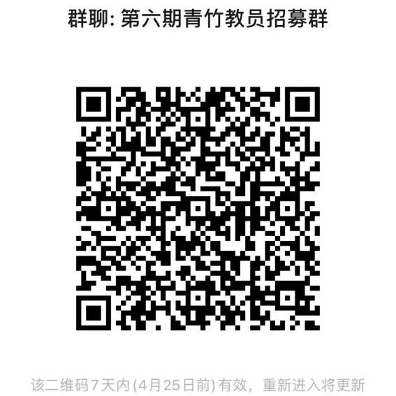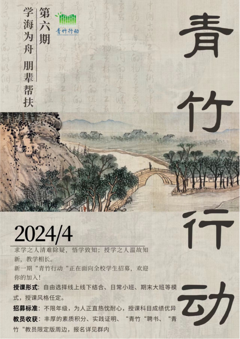 2021至今,青竹行动已经连续推出5期。新学期,我们即将开展第六期青竹行动,现面向全校员工进行新教员招募。第六期青竹行动将结合往期青竹行动的经验,采用线上线下结合、日常小班辅导、期末大班统一授课的模式。你可以自由选择授课科目以及大班或小班的授课模式,包括在小班教学中,你也可以自由选择一对一或一对多两种形式,因材施教,风格自定。