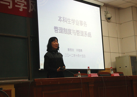 会议开始,许春燕老师从教务处教学管理角度出发详细阐述了本科生学业事务中的管理制度与管理系统,主要内容包括教务处的基本职责、本科生培养方案、本科生学籍管理制度以及本科生学业管理系统这四个方面。讲话中,徐春燕老师重点强调了新生入学的有关注意事项。“善于利用资源,善于挖掘资源”,是许老师的经验之谈,她的讲话为大一新生的网页学习起到了深刻的启迪作用,使同学们对自己的学习生活有了更好的认知能力。