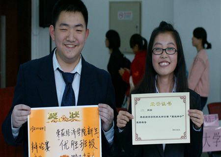 下午五点,四场比赛全部完成,评委在点评完各个队伍的优缺点后举行了颁奖仪式,金融2班,期证1班,经济1班,国贸1班各自取得了比赛的胜利。经济2班二辩金升强,金融2班三辩白杨,国贸2班三辩刘毅凡,期证1班三辩刘鹏举,经济1班二辩王思淇,金融1班三辩刘瞳,国贸1班四辩张羽峰和期证2班王硕荣获了此次新生辩论赛最佳辩手称号。