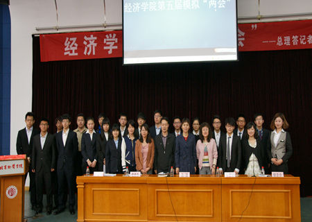 大会第一个环节是记者提问;由国贸一班杨晓阳同学进行开场提问,向“总理”提出的关于新的一年两岸关系问题。“总理”对这个问题进行了认真深度的回答并通过标志性的手势赢得了台下阵阵掌声。随后“媒体记者团”向总理、各部部长提出针对且敏感性十足的问题。其中包括马航失联、反腐、人民币贬值、世界经济和房地产等问题。模拟主席们认真并风趣地解答了记者们提出的各种问题,颇有深度和技巧。在持续了1个小时40分钟的答记者问环节后,“总理”模仿者周楷健同学以他独有的风格进行“答记者问”总结,并对与会“记者”表示感谢,生动形象、惟妙惟肖。