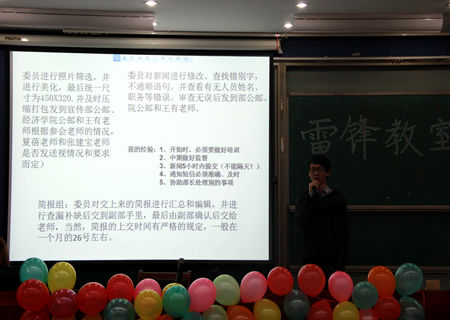 在培训过程中,员工会主席于雪晴首先发表讲话,她从员工会主席角度谈到身为一名主席所要具备的条件和能力,强调除了完成自己院系员工会的各项活动,还要多与校方联系,完成好校员工会的活动;接下来讲话的是分团委副书记张凯迪,她主要介绍了分团委工作主要涉及的方方面面;第三个讲话的是副主席李佳文,他在讲话中谈及构建起员工会这个大家庭,要有个人魅力,强大的工作能力与为员工服务的意识;最后发言的是副主席覃婧,她讲到在员工会里要学会吃苦,要学习怎样做人、做事,以及自我判断。接下来各部部长也发表了讲话,他们每个人都谈到了各部的一些活动的举办和流程的介绍,还有自己的一些感受以及经验。