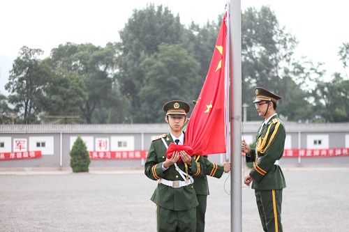 首先由物资公司党委副书记沈小静同志向军训团授团旗,伴着庄严的中国人民解放军军歌,团旗营旗连旗一同飘扬在空中,仿佛在场的同学们每人身上都散发着军魂感染全场。