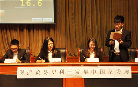 第一场比赛的战鼓由国贸二班和期证一班敲响。在正反双方八为辩手礼貌的自我介绍后,比赛进入了开篇立论环节。正方国贸二班的一辩从自由贸易为切入点,用严谨的定义出发来明确论点,给对手施加了不小的压力;反方也不甘示弱从保护贸易的现状来层层剖析。在随后的攻辩的环节中,双方更是针锋相对、步步紧逼,现场气氛迅速升温,达到白热化阶段。大赛继续进行,进入自由辩论环节。经过一场激烈的“厮杀”之后,最终以期证一班的胜利而告终,正方一辩与反方二辩获得了最佳辩手。
