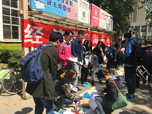 所以无论你喜欢轻松幽默的故事,清新文雅的诗集,还是生动有趣的小说,或者开阔眼界的专业书籍,在这里你都可以找到自己心仪的那本书。一句话可以改变一个人的行为,一个选择可以改变一个人的方向,而一本书却可以改变一个的人生。它带给我们的不止是淘书的乐趣,还有心灵上的慰藉。游走在如此热闹的各班书摊间,总能找到那一抹心中的小确幸。伴着同学们爽朗的吆喝声,和交流的低语声,给我们的校园增添了别样的风采。