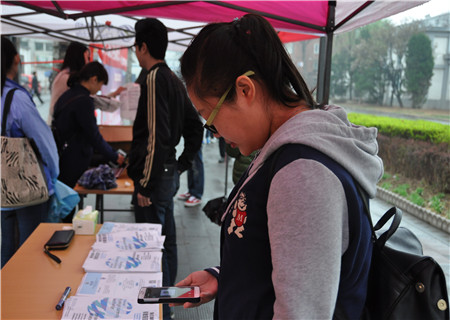 尽管湿冷的天气导致部分同学不愿驻足了解活动情况,但是外联部的成员依然积极地宣传,他们一次一次将宣传单递给来往的同学,参与者逐渐多了起来。为了吸引更多的同学,在活动启动现场还有三轮可以领取支付宝绕口令红包福利的机会,开奖时间分别是11点、12点、13点。整个活动也从上午十一点持续到下午一点,细雨微风的凉意也无法阻挡大家尽职尽责的心。