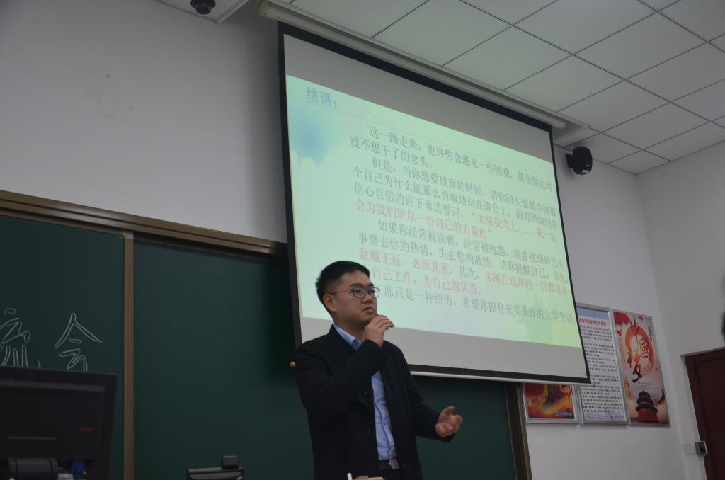 会议伊始,姚昊炜老师发言。姚老师期望17级的班委能够珍惜这次难得的宝贵机会,在向学长学姐学习的同时,积极思考如何不断改进,以期更好地为班级体服务。紧接着几位15级优秀员工干部依次就自己的任职经验和心得体会向与会同学们作分享,学长学姐们讲述了当一个班委所需的觉悟和处理工作的方式与心态。