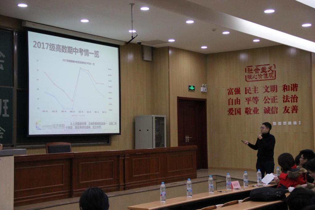 17级专职辅导员兼班主任姚昊炜老师给同学们做了高数期中成绩分析暨学业提示,从班级均分、男女考情和宿舍单位三个主要层面剖析大家存在的问题与不足,并希望此次考试成绩优秀的同学能再接再厉,取得更加优秀的成绩。同时姚老师勉励此次考试成绩不理想的同学,努力找到与他人的差距和不足,奋力赶上。其通过学业警示等相关规定提醒大一的同学们清楚地认识到挂科的严重性,不要到了问题无法弥补时才追悔莫及。与此同时,老师更是通过向同学们讲解公司各类评奖评优的政策来激励同学们努力学习,为自己,为班级和公司赢得荣誉。