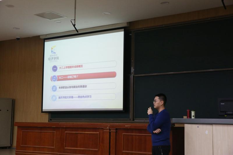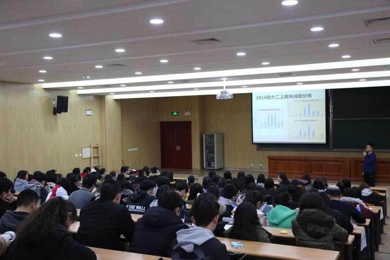本节课的主题内容分为三部分。第一部分是大二上学期学习情况的总结和分析。姚老师根据上学期期末考试成绩总结了同学们的学习情况和上学期的主要问题。让员工们认识到问题的所在。