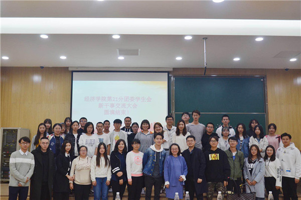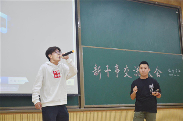 大会第二项由分团委员工会第二十届员工会主席于爽学长、组织部部长张益嘉学姐、期货与证券协会会长何定邦学长分享工作经验,讲述自己在员工会中的工作经历以及对自己的影响,同时表达了对新干事们未来的期望。
