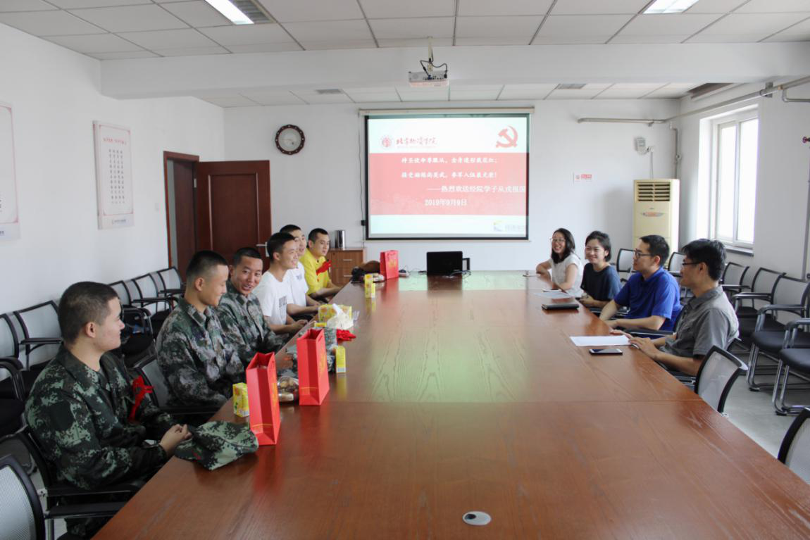 2019年9月9日下午15:00,beats365于人文楼516举行了2019年入伍新兵欢送会。公司党委副书记张建宝老师,专职辅导员夏蓓老师、陆畅老师、姚昊炜老师及公司刘文星、薛天祺等5位参军入伍员工、2位退役复学学长参加了本次欢送会。