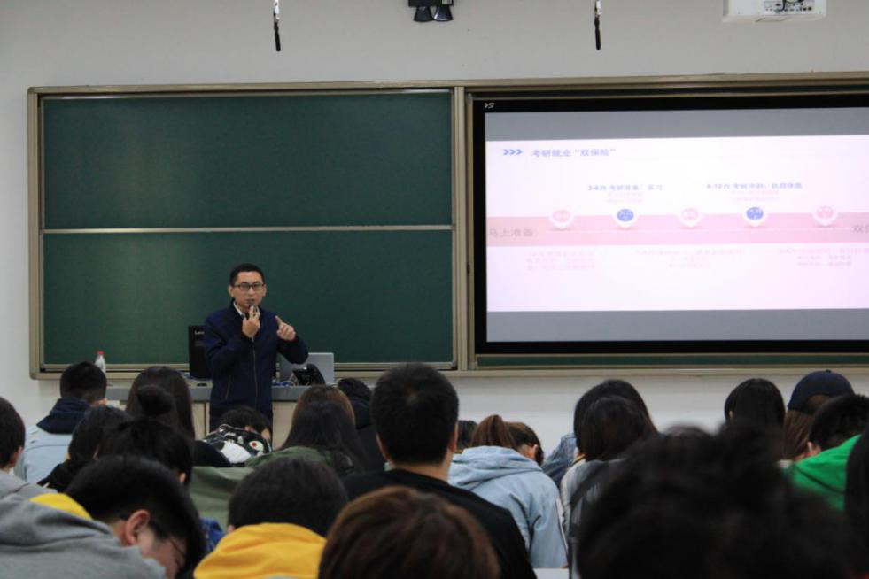 张老师从“详解就业方向”﹑“专业发展要点”切入,介绍了各专业的特点和就业领域,同时也分析了各就业领域未来的发展前景。随后,张老师为同学们重点讲述了怎样做到“考研就业‘双保险’”,并对于如何平衡考研与就业的关系这一问题为同学们提出了一些建议。同时张老师还根据老员工活大致要经历的时间段为同学们做出了详细规划,以确保同学们能充分利用毕业前的各时间段,并把握好每个机遇。此外,张老师还以具体事例提醒同学们就业实习所需注意的事项,如个人简历的书写﹑把握招聘时间﹑提前了解公司基本信息等。