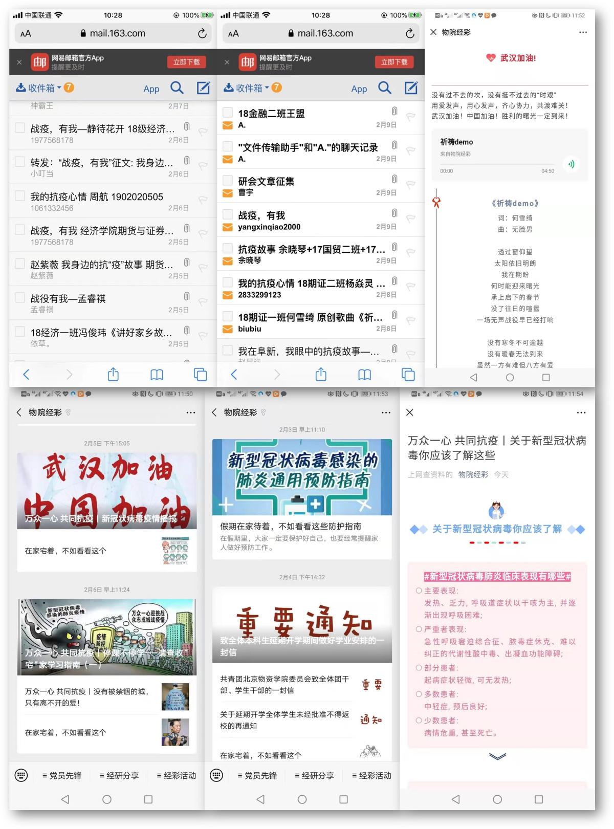 一方面在疫情来临之际,各团干部与员工骨干在假期中积极配合公司开展系列战“疫”主题团学活动,如研究生会发起“战疫,有我!”主题故事征集,面向本硕同学们征集家乡抗疫事迹,讲述自己战疫感悟,号召同学们共同以实际行动加入抗击疫情,为武汉加油。同时分团委员工会在各年级大力推广“众志成城、共克时艰”主题团日活动,以生动多样的形式开展团建工作,鼓励广大经院学子用独特的参与方式为战胜疫情贡献力量,其中经院学子自主原创歌曲《祈祷demo》充分代表了时下广大同学对疫区人民的关心和问候,“一方有难,八方有爱”的创作主题得以充分展现,一经推出,广为传唱;另一方面,研会调动研究生群体充分发挥专业学术带动效应,积极整合校内外学习资源,编辑假期学习指南、推荐阅读书目,鼓励同学们在假期“停课不停学”,做好学业规划;与此同时,经公司分团委员工会精心设计、统一编排,“物院经彩”微信公众号疫情期间及时发布疫情防控科普指南,提醒同学们减少外出,注意个人防护与手部卫生,保持良好的卫生健康习惯同时号召同学们关注官方渠道和权威媒体的疫情通报,引导同学们高度重视防控工作,提高防范意识,理性看待疫情。