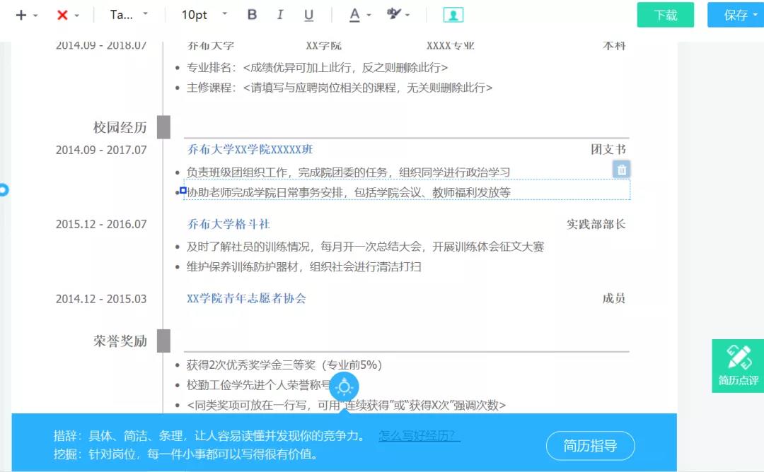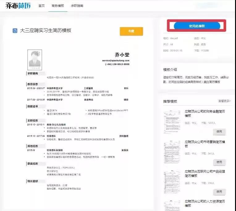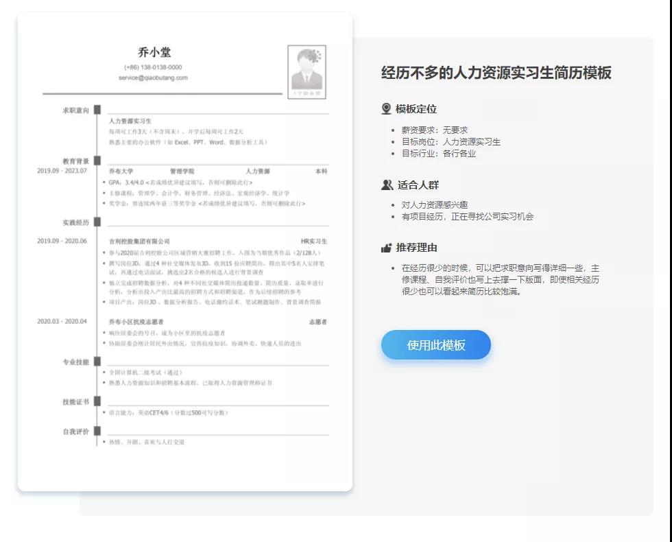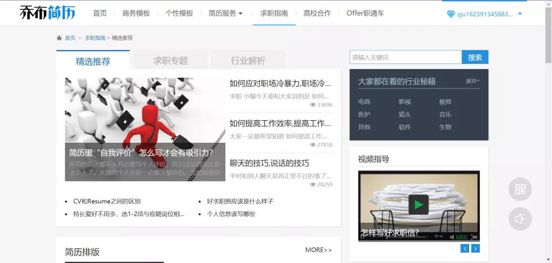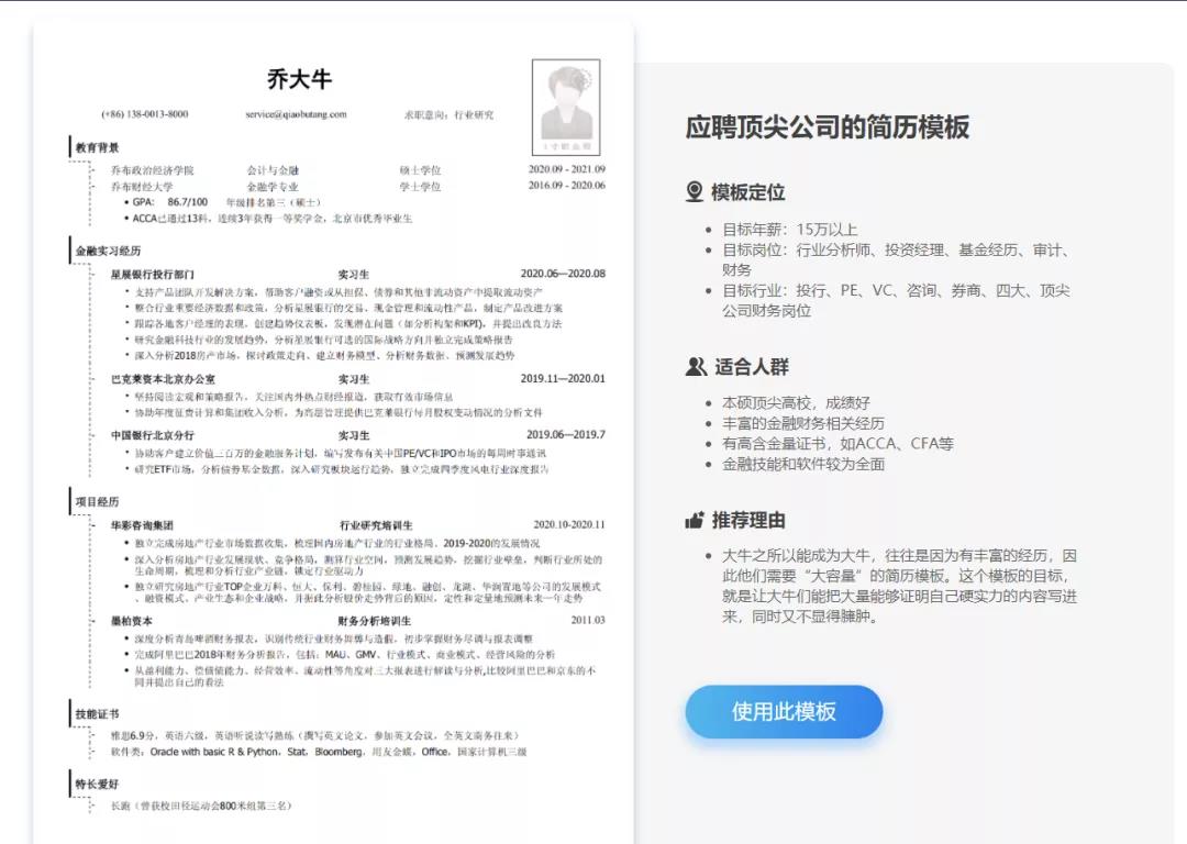 乔布简历网站拥有简历模板、编辑器、经历库、求职指南干货文章,你可以自由选择自己需要的项目获得帮助。