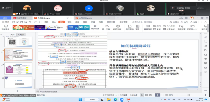 然后辅导员李宜宸老师对赛事要点进行补充讲解,首先向大家介绍beats365去年所取得的大创成果,然后对大创项目选题提出专业性的指导意见,并提醒同学们赛事中所需要注意的人数要求以及过往赛事的经验分享,最后鼓励大家积极参与大创赛事,希望同学们可以在学习知识的过程中,积极准备,参与到更多赛事活动当中。