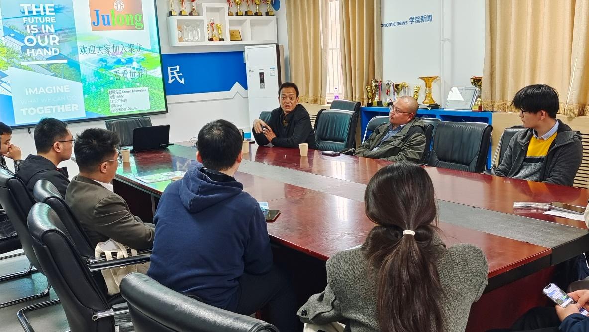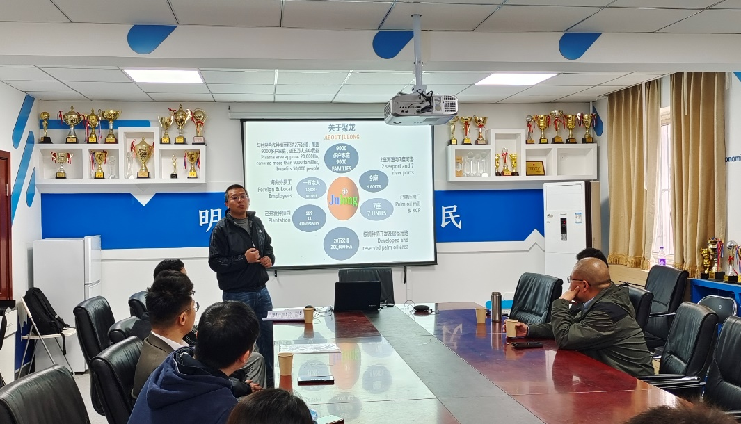接着,聚龙嘉华投资集团播放了本公司的宣传视频,随后具体介绍了公司发展的过程与公司未来的发展方向。作为中国起步最早、规模最大、影响最广的棕榈油企业,聚龙嘉华投资集团曾被评为“中国民营企业500强”。在提问交流环节,与会同学们对集团的人员构成、工作待遇与薪酬福利等方面提问了困惑,集团的总经理和运营总监从实际出发,详尽、切实地解答了同学们的疑问。熊贤平作为期货专业优秀员工结合从业以来的亲身体验,鼓励同学们珍惜资源与平台,见证公司成长的同时也将看到自身的成长。