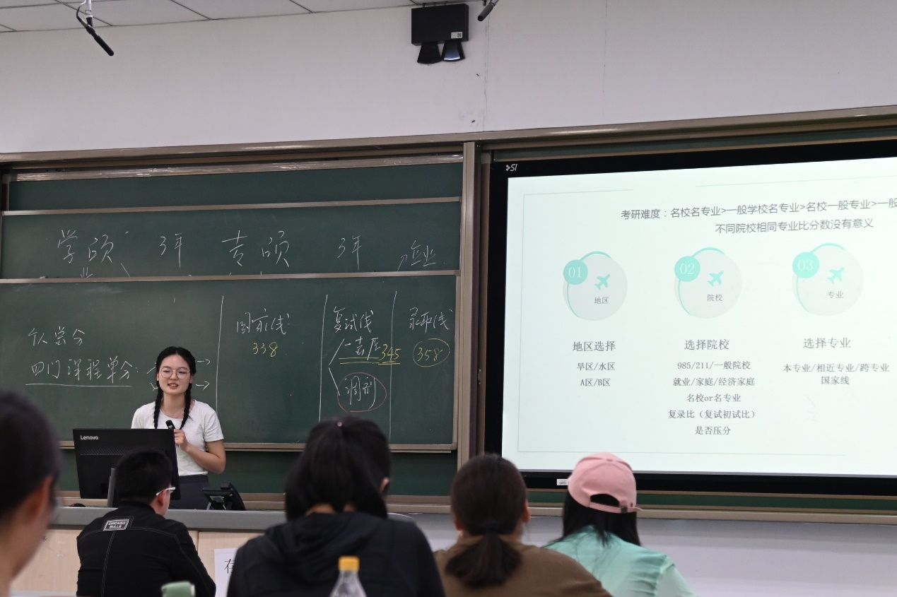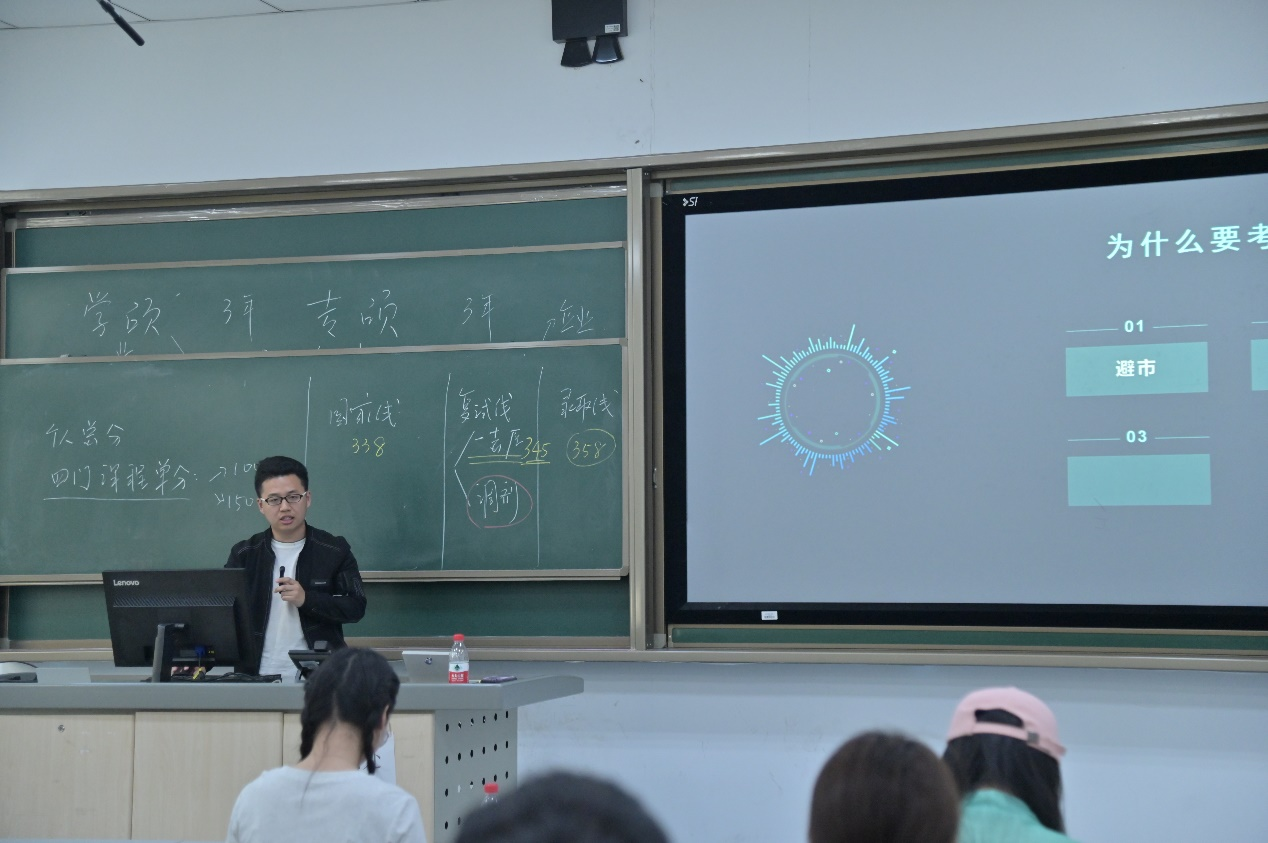 王有老师从考研的目的、当前形势、公司研究生录取情况及相关建议几个方面,向同学们从大局角度剖析,提出了考研中选择的重要性,强调要从自身实际情况出发,了解研究生招考的相关政策,做出最稳妥的报考选择,并对报考本校研究生相关政策进行了细致解读。同时,也对坚定追梦的同学们表达了鼓励。