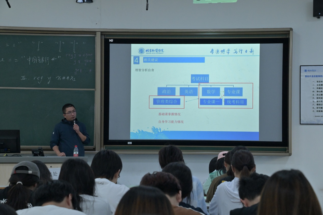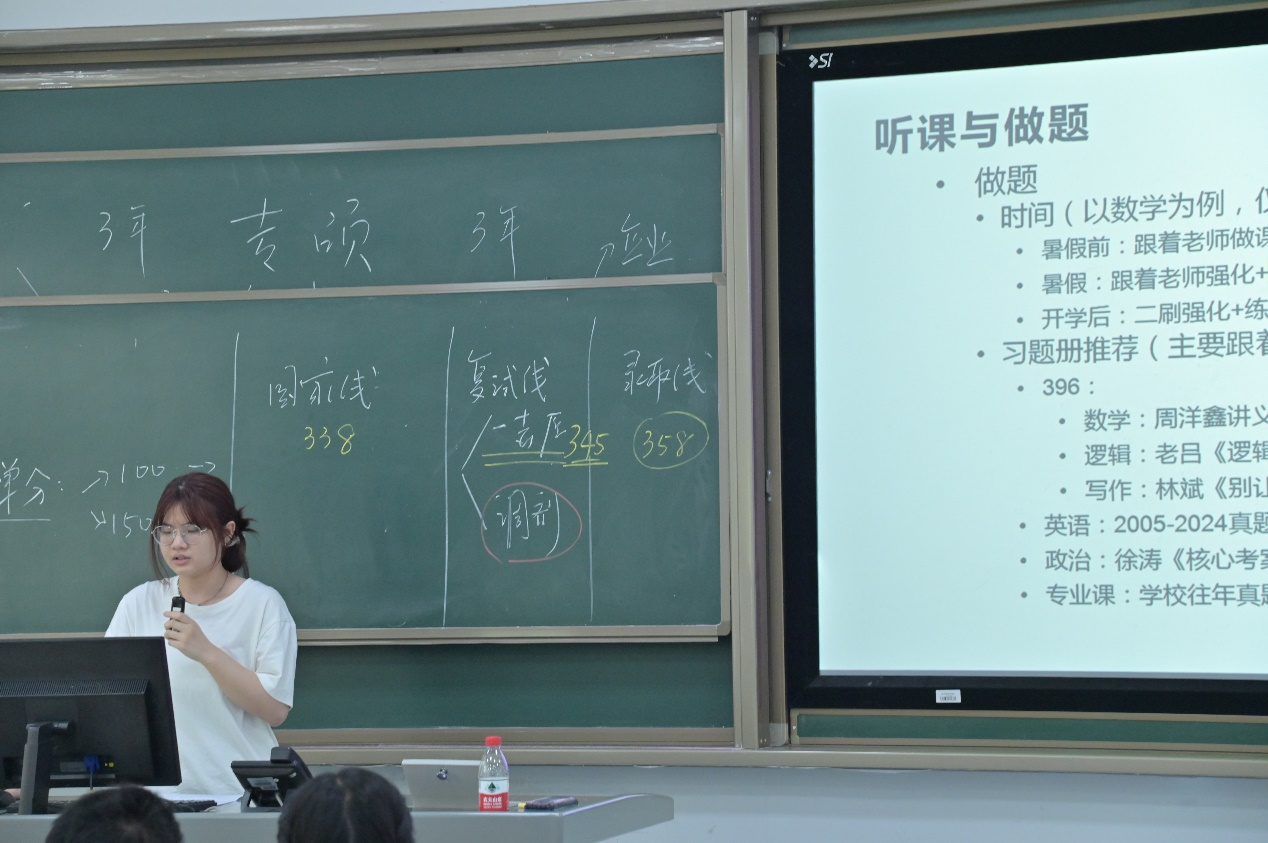最后,三位高分上岸首都经济贸易大学、浙江财经大学、北京工商大学的学长学姐们就各自考研经历,倾囊相授,向同学们提出了数条高效且有针对性的备考方法,结合自身介绍了择校和备考的心路历程,以及在遇到阻碍时的调整方法。并在结束时表达了对学弟学妹们真诚祝福。在自由交流时间环节中,同学们也对考研与就业提出了自己的疑问,老师和学长学姐对同学们的问题进行了详细的解答。