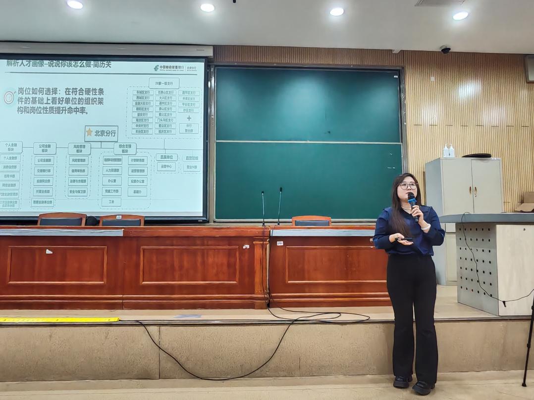 针对人力资源视角的求职者画像,负责人解读了优秀人才应具备的能力素质、个人特质和发展潜力,还详细介绍了银行招聘流程及各环节筛选重点。在实习相关分享中,王学明给出不同阶段找实习的建议,她表示,大二年级同学可以通过日常实习积累经验,大三年级同学则需注重提升实习质量,同时鼓励同学们积极观察学习,了解企业组织架构、业务流程和产业定位,挖掘实习价值。在宣讲会的最后,王学明以“求职阳光心态”为主题,激励同学们在求职中要保持乐观,勇于尝试,面对求职挫折,坚信“天生我材必有用”,把握时代机遇,实现自身价值。