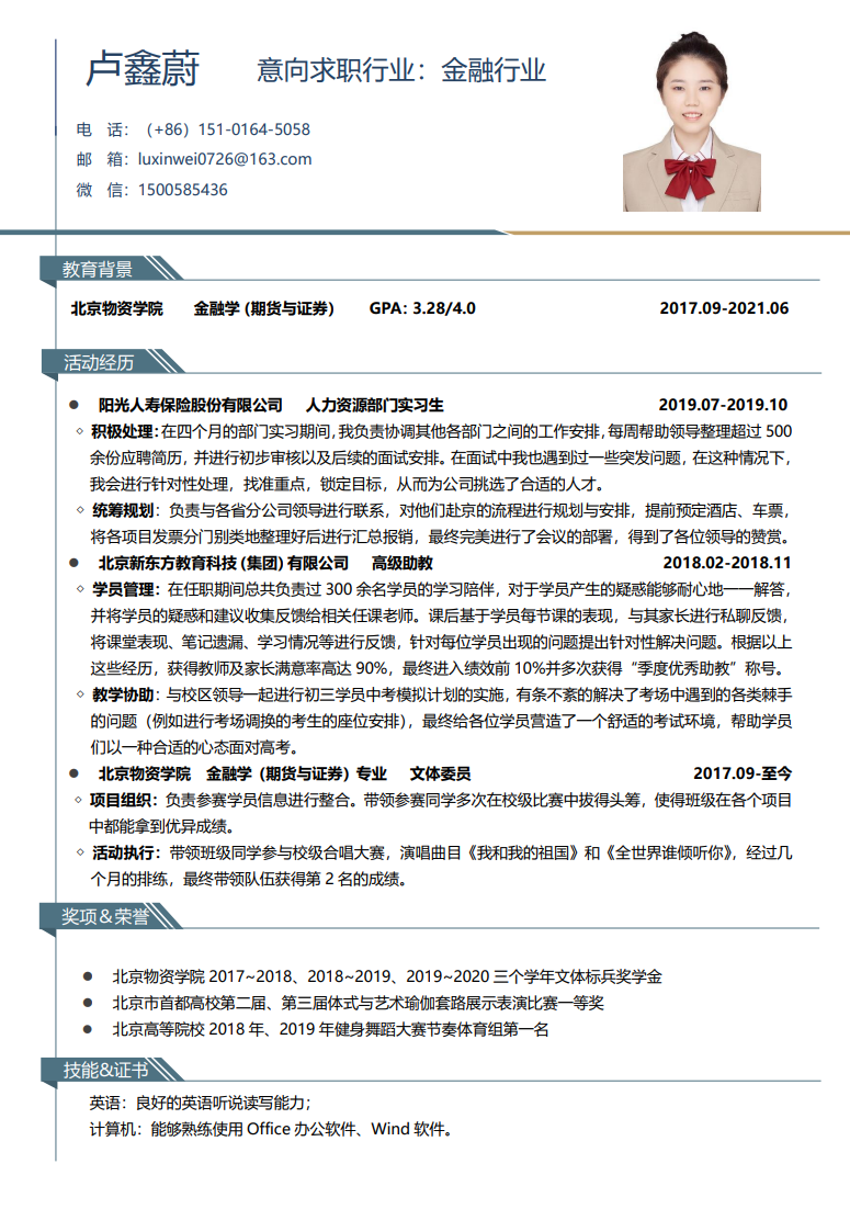 大一学年我曾在北京新东方教育科技(集团)有限公司进行了为期10个月的实习工作,在此期间我负责与老师、家长和同学们进行联系与沟通,课堂上我会对学员的作业以及随堂测试进行批改,并对一些找我询问题目的学员进行题目的讲解。课后我会将学员的上课情况、本周作业进行汇总,一一反馈给家长,让学员可以按时完成课业任务。在这段实习中,我的沟通能力、整理能力以及数据分析能力都得到了提升。大二学年我在阳光人寿保险有限公司的人力资源部门进行了为期4个月的实习,期间我主要负责对投递的简历进行审核筛选、负责维护系统中的员工信息并参与核算报表等工作。在这4个月的实习时间里,我的甄别能力以及抗压能力进一步得到提升。课余时间我喜欢参加一些运动,如瑜伽和健身舞蹈,在挥洒汗水的时候我会感到很开心,同时自己的心态也会感到很放松,每次训练下来尽管已经筋疲力尽了,但随着越来越能跟得上的节奏和越来越熟练的动作,我不禁为自己感到雀跃。所以我从大一开始报名参加了首都高校体式与艺术瑜伽套路展示表演比赛和北京高等院校健身舞蹈大赛,分别在三年内斩获五个一等奖。