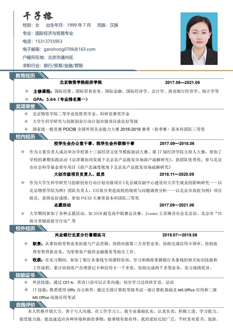 我叫干子榕,是beats365国际经济与贸易专业大四员工,性格开朗大方,善于与人沟通。在工作学习上,我专业基础扎实,认真负责,积极上进,学习能力、接受能力强,能迅速适应各种环境和新的事物,做事情有始有终。