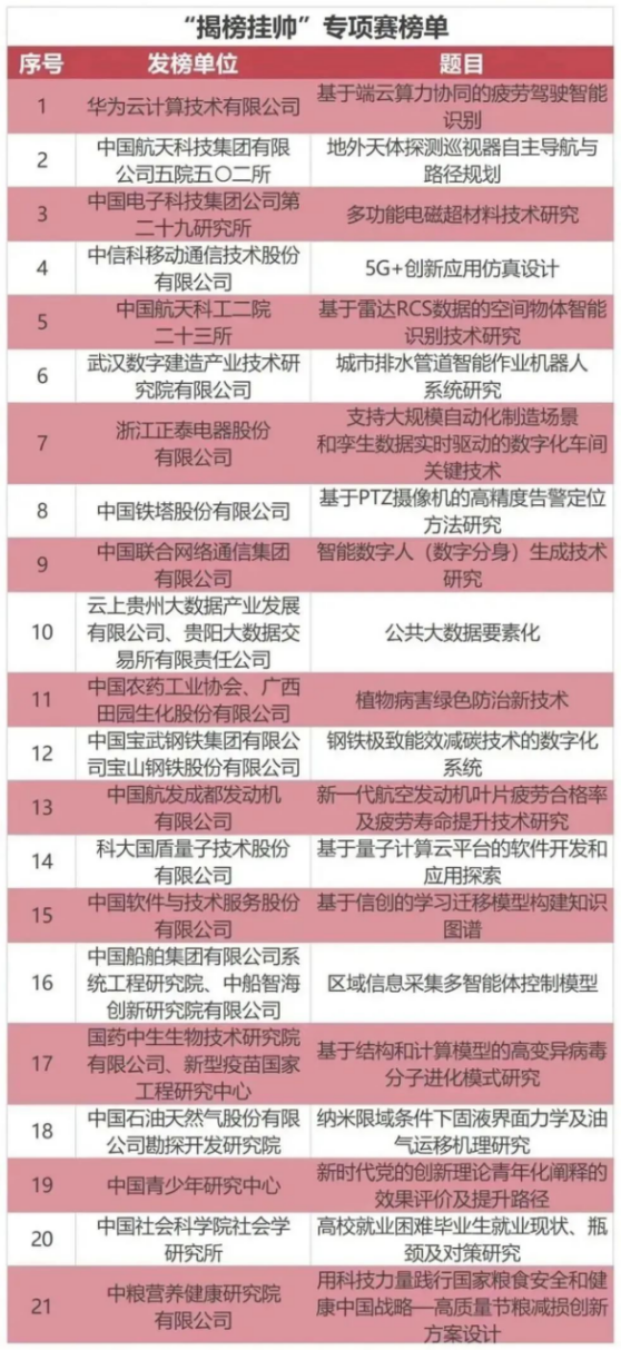 四、内容要求:“揭榜挂帅”以“政企发榜、竞争揭榜、开榜签约”的方式,通过“征榜—发榜—竞榜—评榜—夺榜”,最后针对每个选题评出1名“擂主”。“揭榜挂帅”专项赛榜单针对以下项目榜单,现面向全国高校员工广发“英雄帖”,欢迎各参赛团队选择榜单中的题目开展研发攻关!(具体各项揭榜内容,详细参阅附件)