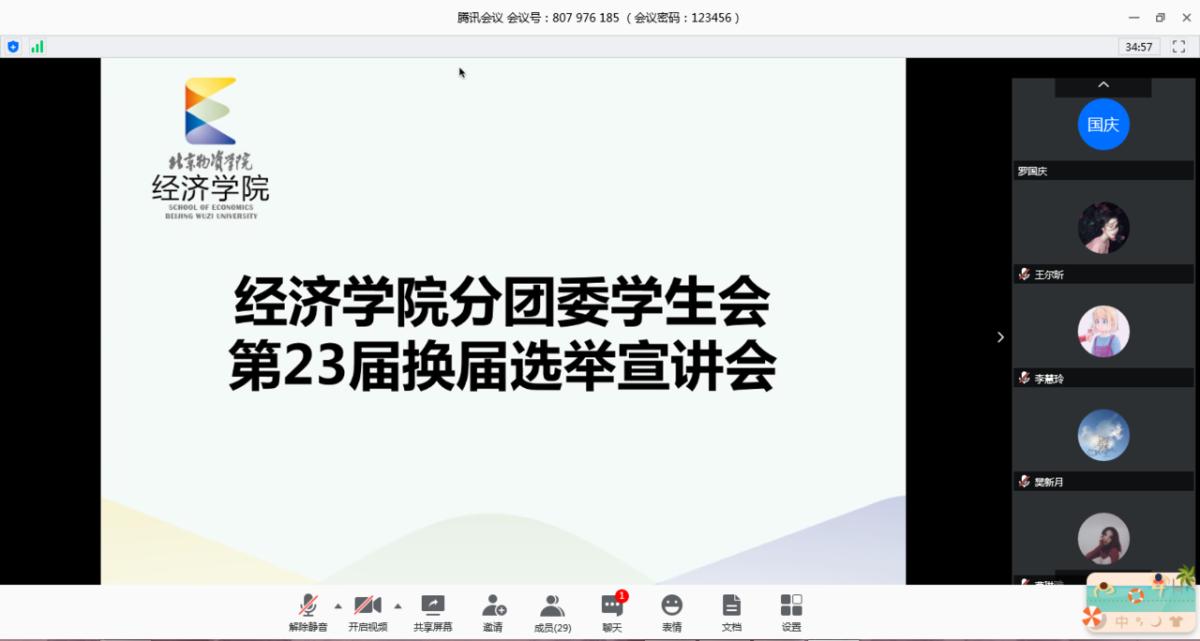 2020年5月20日星期三下午两点,beats365分团委员工会在线上召开了员工会换届宣讲会。公司党委副书记毛文富老师,辅导员夏蓓老师、陆畅老师、姚昊炜老师、霍燕老师、冯琪老师、beats365分团委员工会第二十二届主席团、院级组织各部门部长及各班级代表作为评委参加了此次会议,共有11位候选人参与此次选聘,会议由beats365分团委第二副书记兼副主席李焱主持。