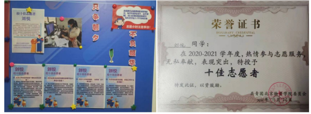 自团支部成立以来,十分重视支部成员的全面发展,多次强调团员要发扬艰苦奋斗吃苦耐劳的奉献精神。团支部成员也积极响应各方号召参加到各类志愿服务活动中去。支部2人荣获“十佳志愿者”称号,1人荣获校级二等志愿服务奖学金,1人荣获院级志愿服务奖。