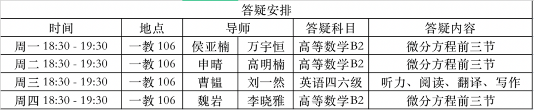 根据问卷统计,学业发展辅导中心将开展英语四级、英语六级和高等数学共三门课程的答疑。答疑时间为周一至周四晚18:30-19:30,答疑方式为线下答疑,答疑地点为一教106(备用教室一教214)。根据导师记录,参加线下答疑的学员将会获得综合素质积分1分/次,有意愿参加答疑的同学可以扫描下方二维码进入学业发展中心答疑群。