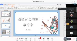正式分享班级同学的身边故事让我们收获了温暖,范亚娟同学用家乡河南信阳的对比向大家展示了众志成城的信心。张万强同学介绍了“李姨”与家里人用智慧发明收获的最真情的互动,分享了不出家门的锻炼方法,也讲述了自己对家乡最真挚的担忧。
