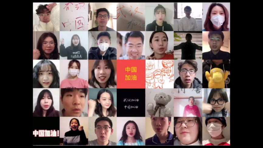 接着,第二部分是观看班级拍摄的疫情加油视频,视频素材是全班同学,剪辑由田昱欣同学完成。视频拍摄于2月初,疫情的风暴眼——武汉正处于最艰难的时候,视频的内容则是班级同学们对于武汉的支持与鼓励,对祖国的守望与陪伴。