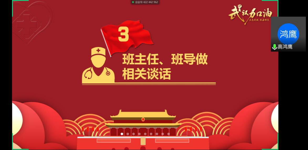 班会开始,由班长丁苑芳同学做开头讲话,阐明班会流程纲要并总结疫情发生以来本班开展过的集体抗疫活动。