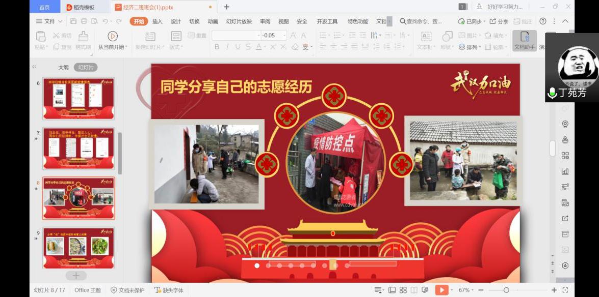 正可谓“疫情无情人有情”,面对此次疫情,班级中也有一些同学除参加了班级的共同抗疫活动之外,结合自身实际情况,不惧危险、勇于担当,成为了光荣的抗疫社区志愿者,罗国庆同学就是其中光荣的一员。此次班会中,他向同学们分享了自己加入当地社区和村委会抗疫战斗队伍的经历,他说:“在疫情期间,我自愿到社区报道,加入抗疫队伍,跟随党员先锋进入居民家庭送口罩、在路口站岗执勤。在志愿服务的同时,我也认识到身为经济学子要身体力行投入到为国服务的行列,才能更加彰显物院青年担当,书写人生美丽华章。”同时他还鼓励更多行有余力的同学:“希望同窗们积极参与抗疫志愿队伍中,在党的领导下和人民群众一起戮力同心战胜疫情。望疫情结束,国泰民安!”