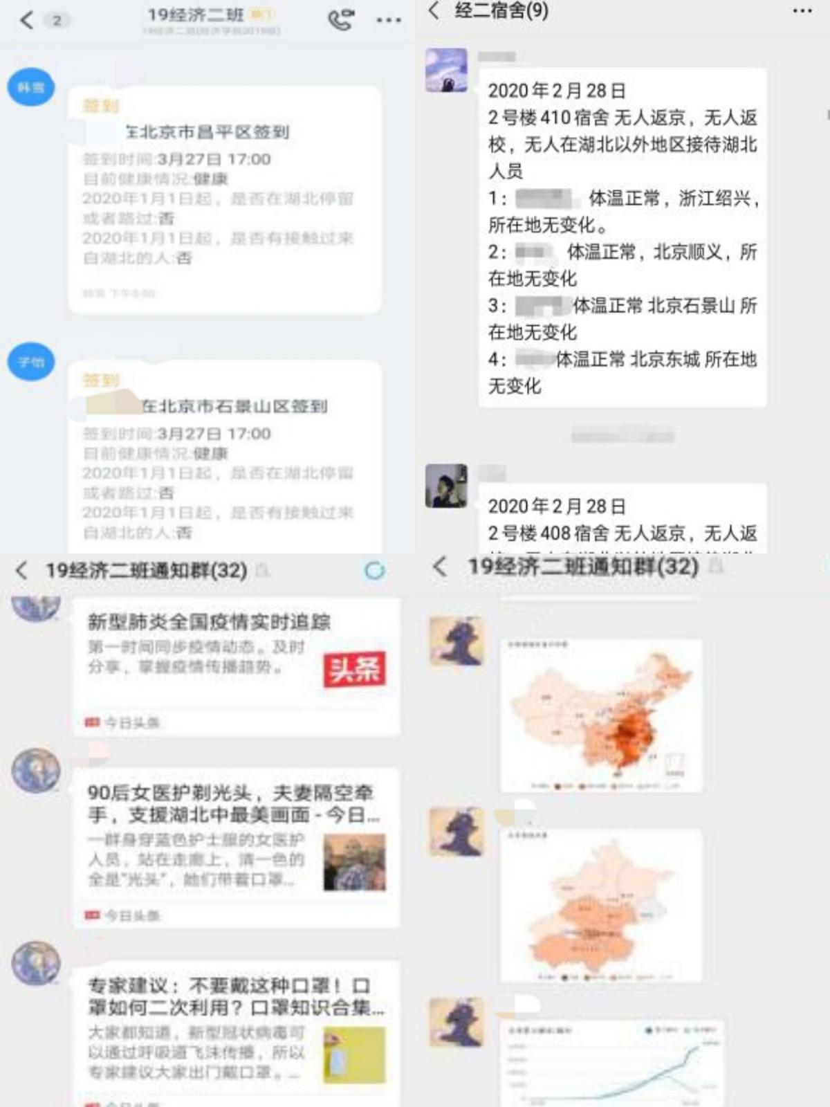 此外,班级群里坚持开展信息接龙活动。同学们每天轮流在班级群里发一些自己当天了解到的疫情相关新闻,既使自己对疫情的了解程度有所提高、也向其他同学们宣传了重要的疫情信息和可贵的抗疫精神。并且,分别使用过宿舍长负责报告形式、钉钉签到等方式每日确认所有同学们的健康状况等重要信息,以确保同学们远离疫情危险。”